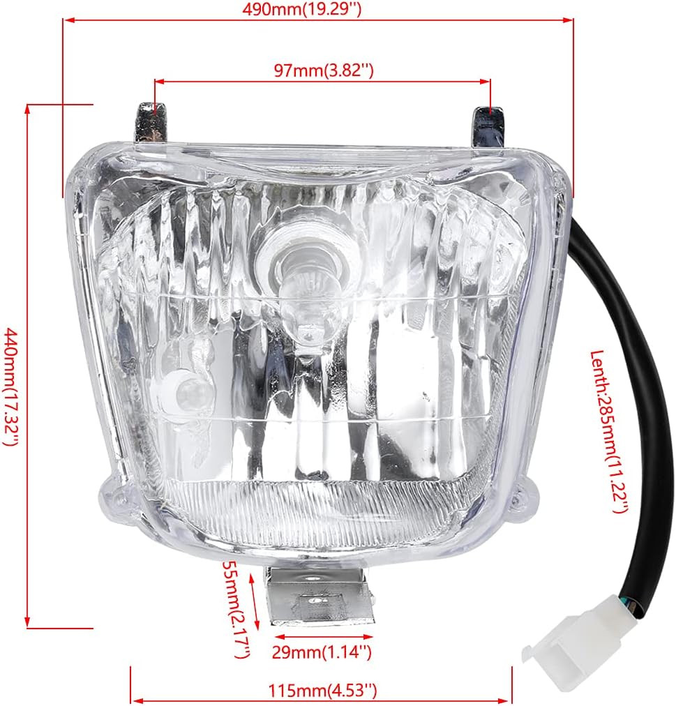 - 【Size】Headlight: Length : 440 mm / 17.32 inches<br>Width : 490 mm / 19.29 inches .Tril Light :Length : 128 mm / 5.04 inches,Width : 25 mm / 0.98 inches,height: 34 mm / 1.34 inches, Mounting bolts center to center: 88mm / 3.46 inches. Before purchasing, please carefully verify the product images, model, and dimensions. If you have any questions about compatibility, feel free to leave a message for consultation