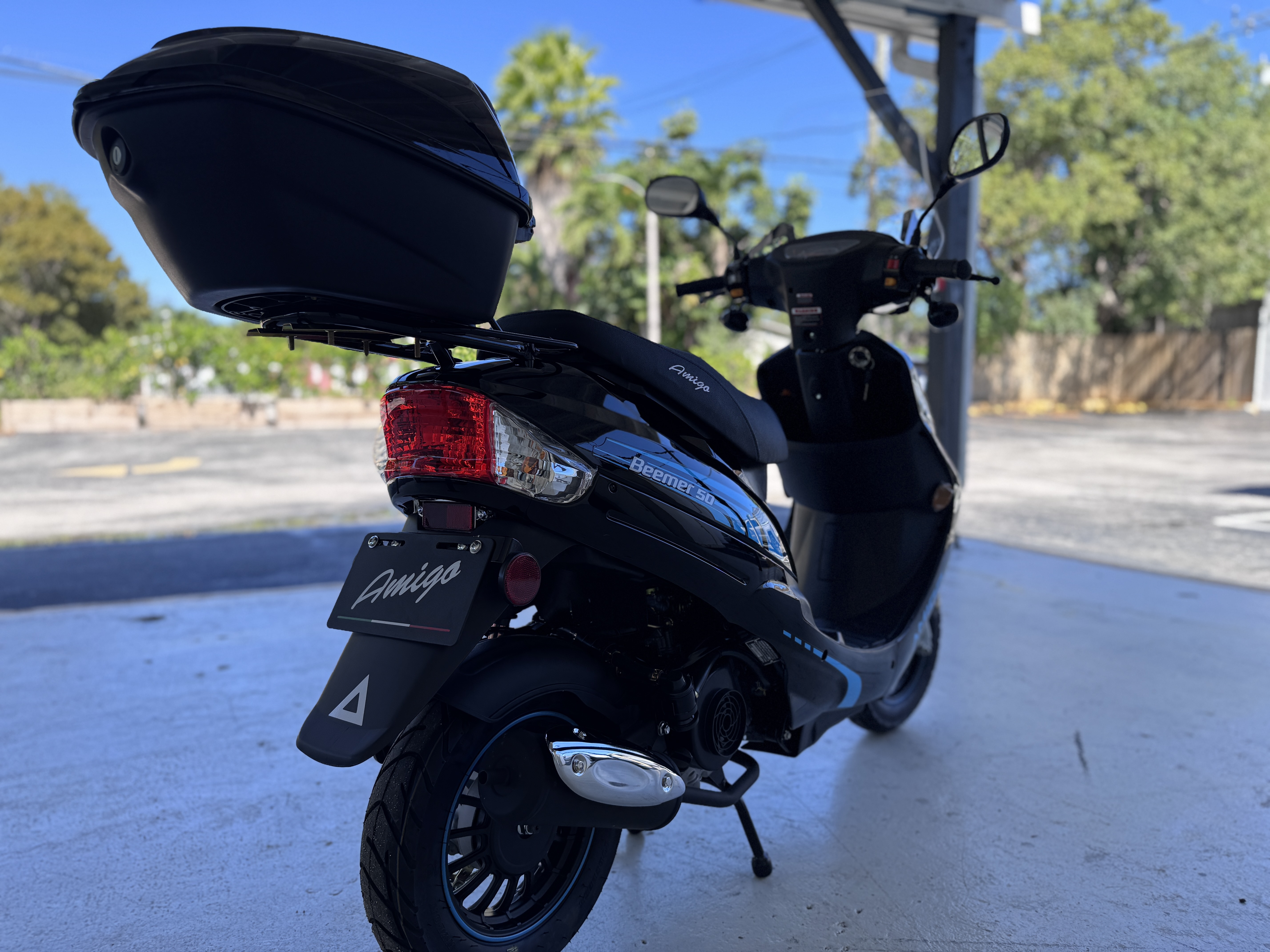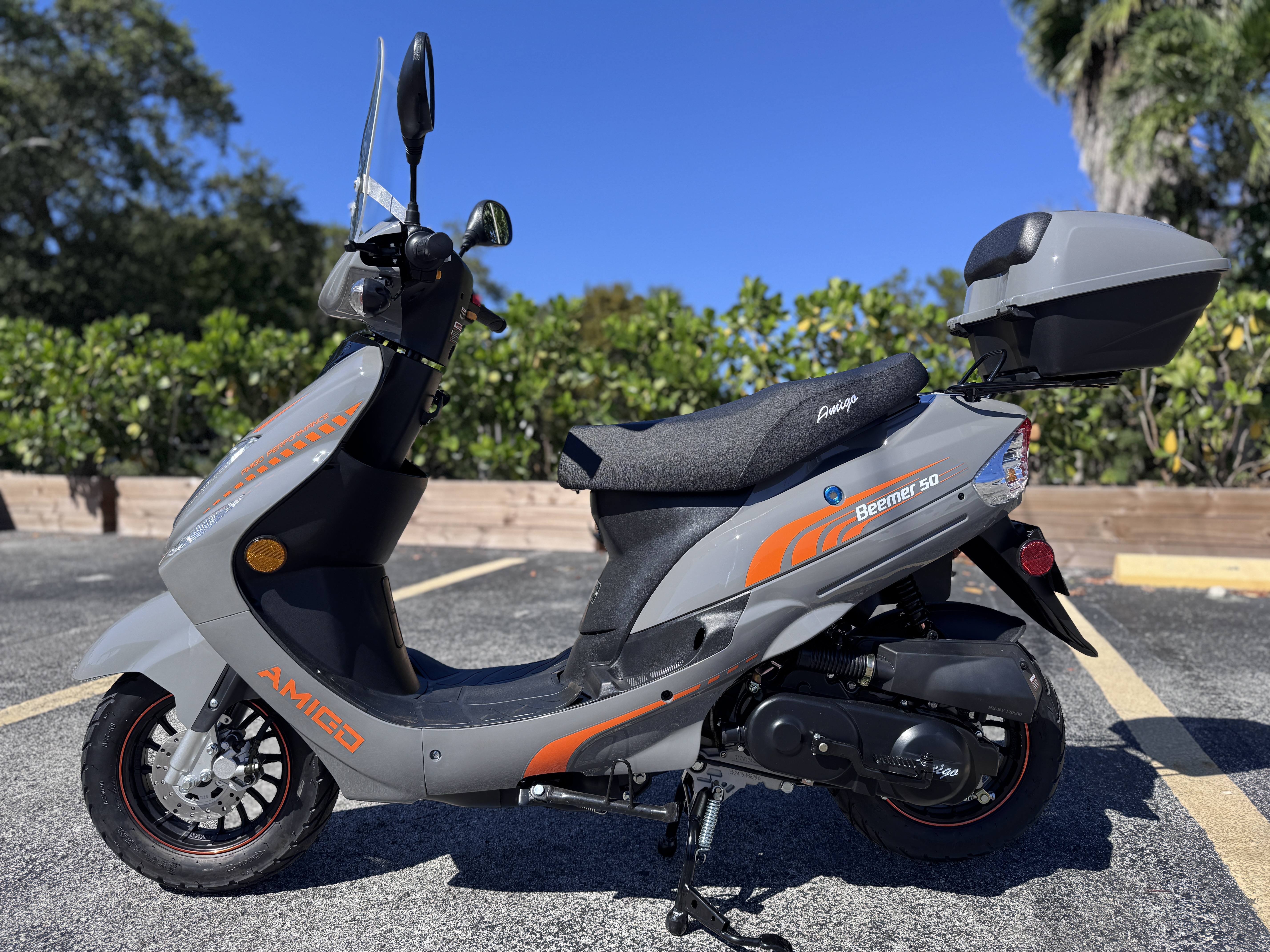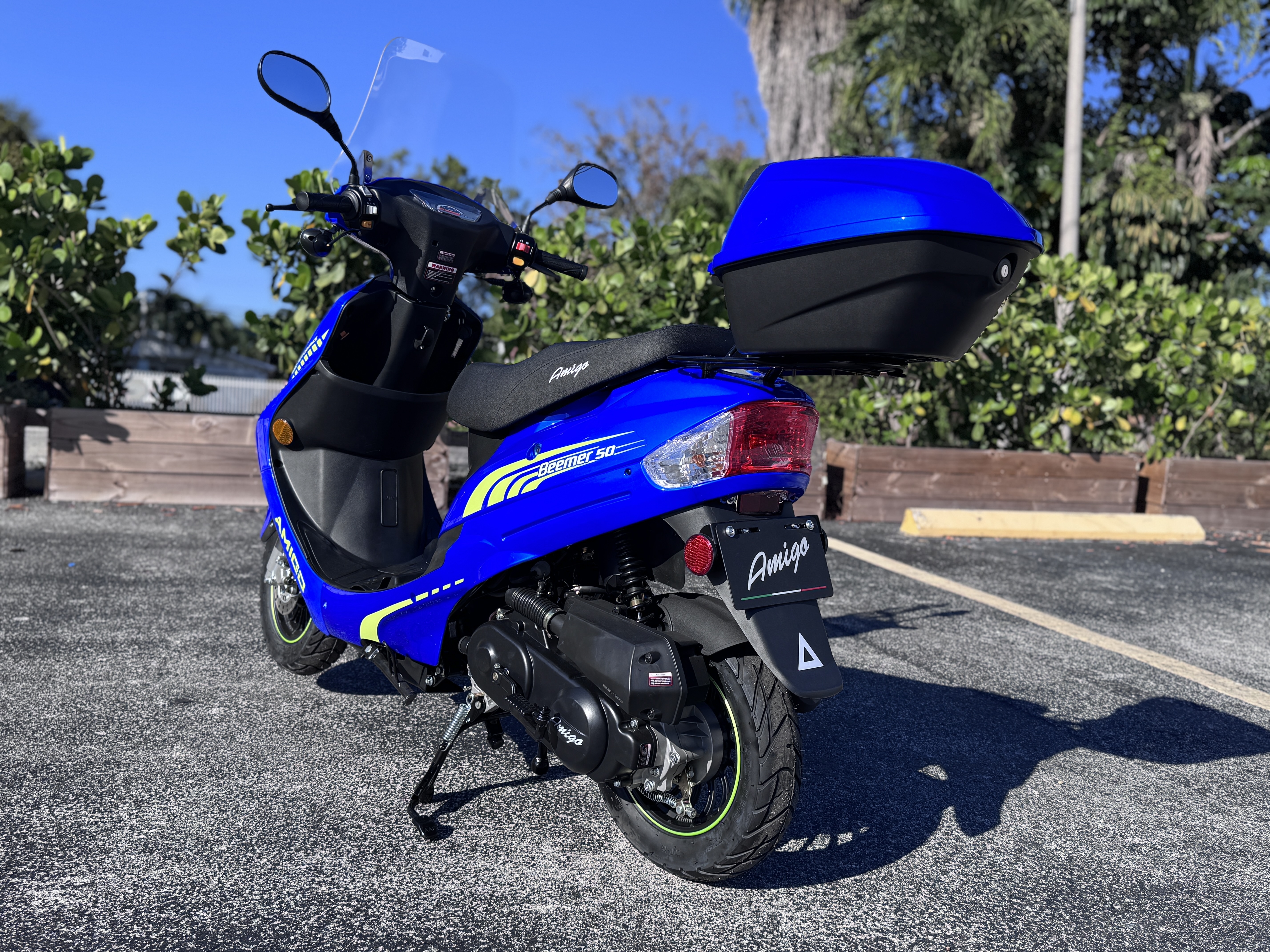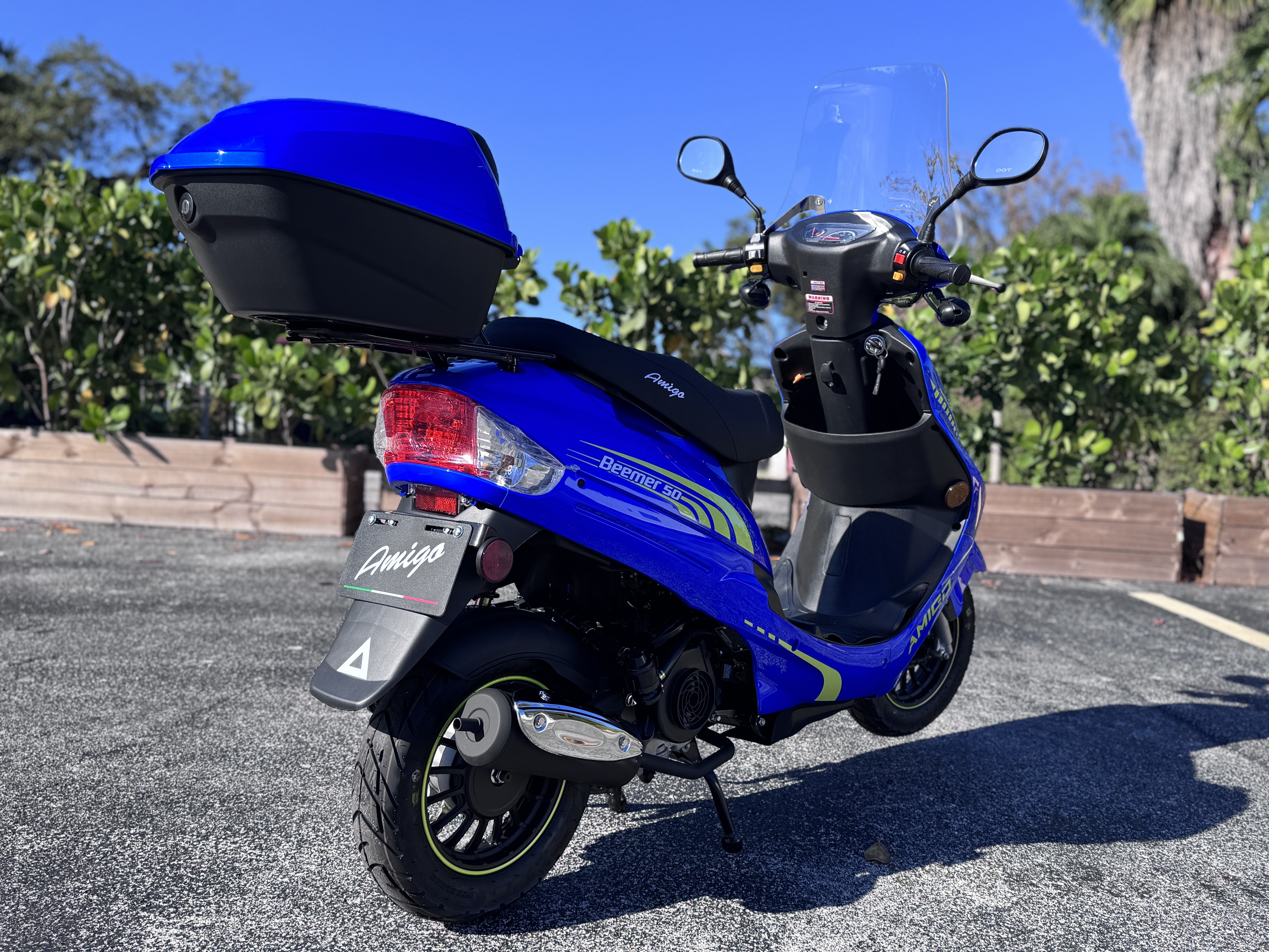 Featuring an automatic CVT transmission, the Beemer-50 offers true twist-and-go convenience, making it ideal for beginners and experienced riders alike. Practical upgrades such as a digital LCD display, adjustable windshield, lockable color-matched trunk, and USB charging port enhance everyday usability. Lightweight, economical, and fully EPA, DOT, and CARB compliant, the Amigo Beemer-50 is a smart and dependable choice for affordable transportation.