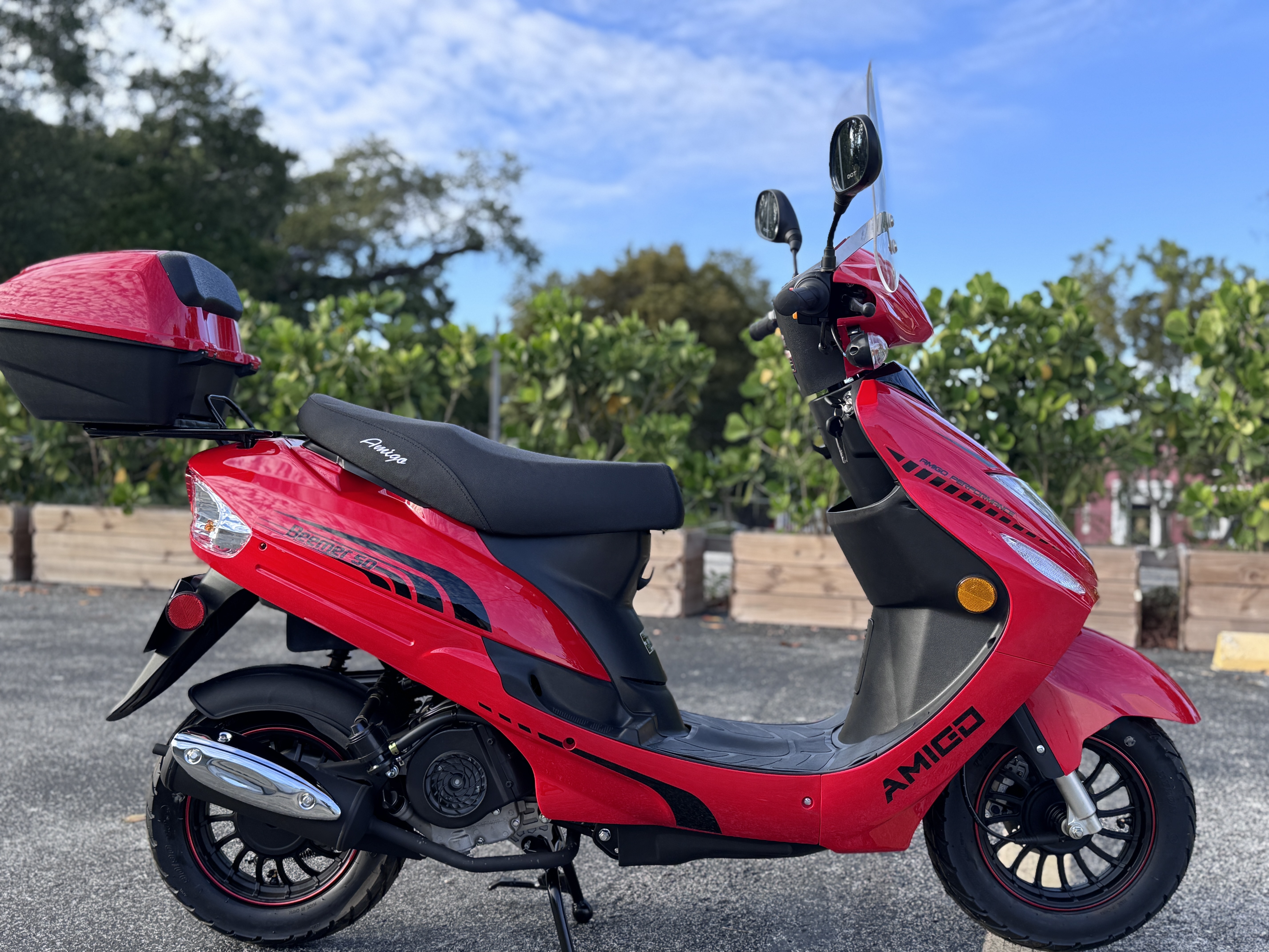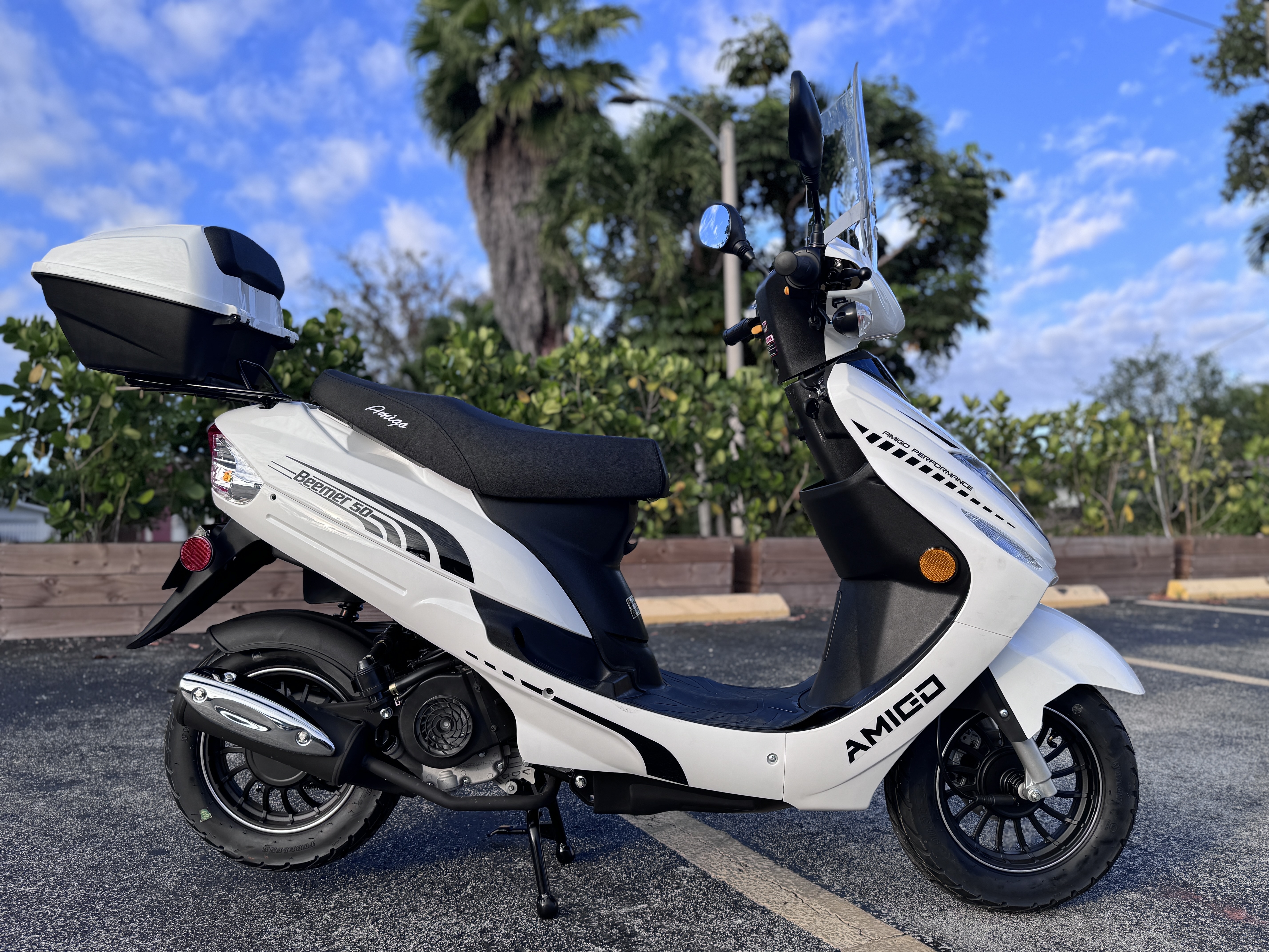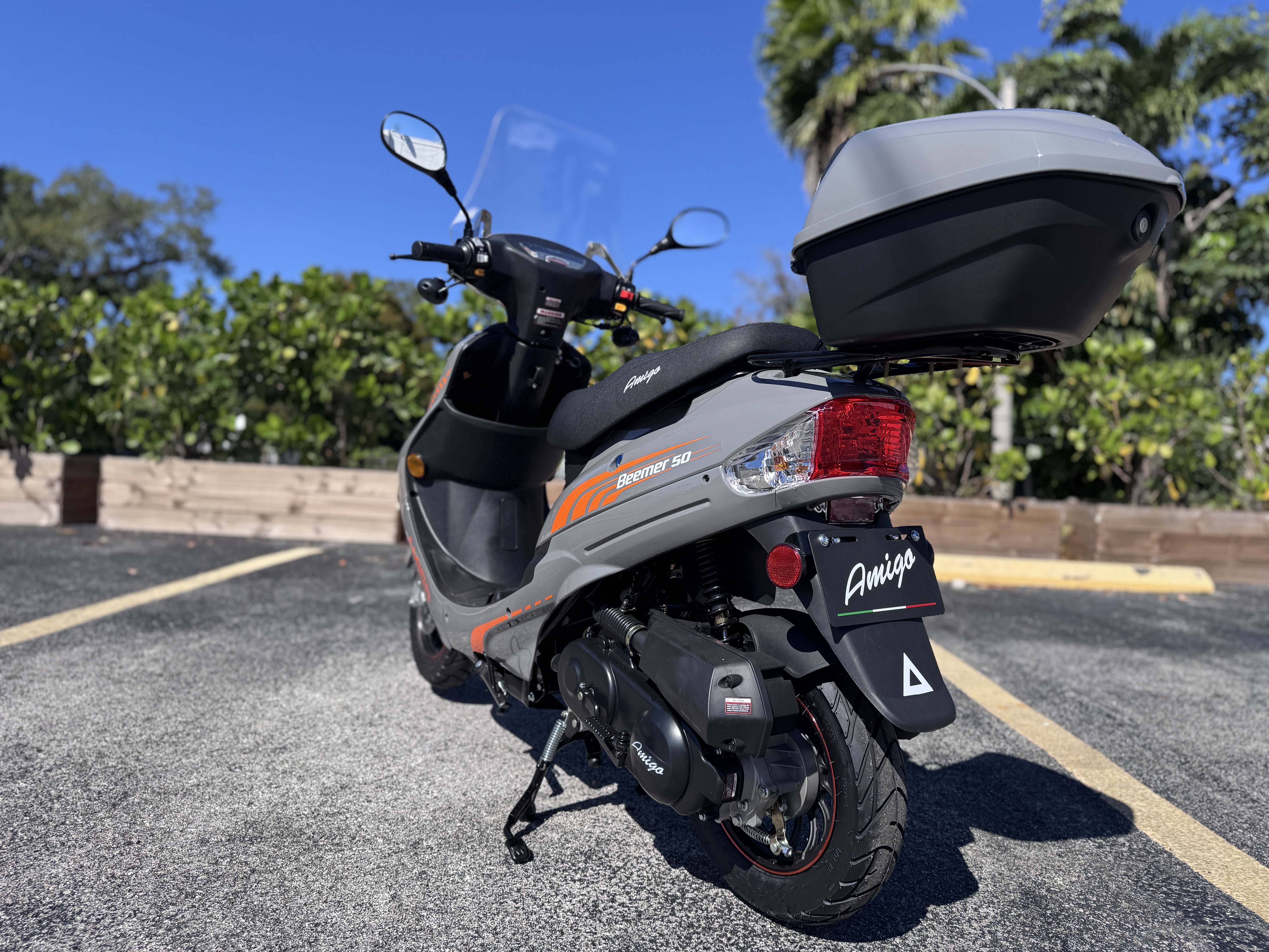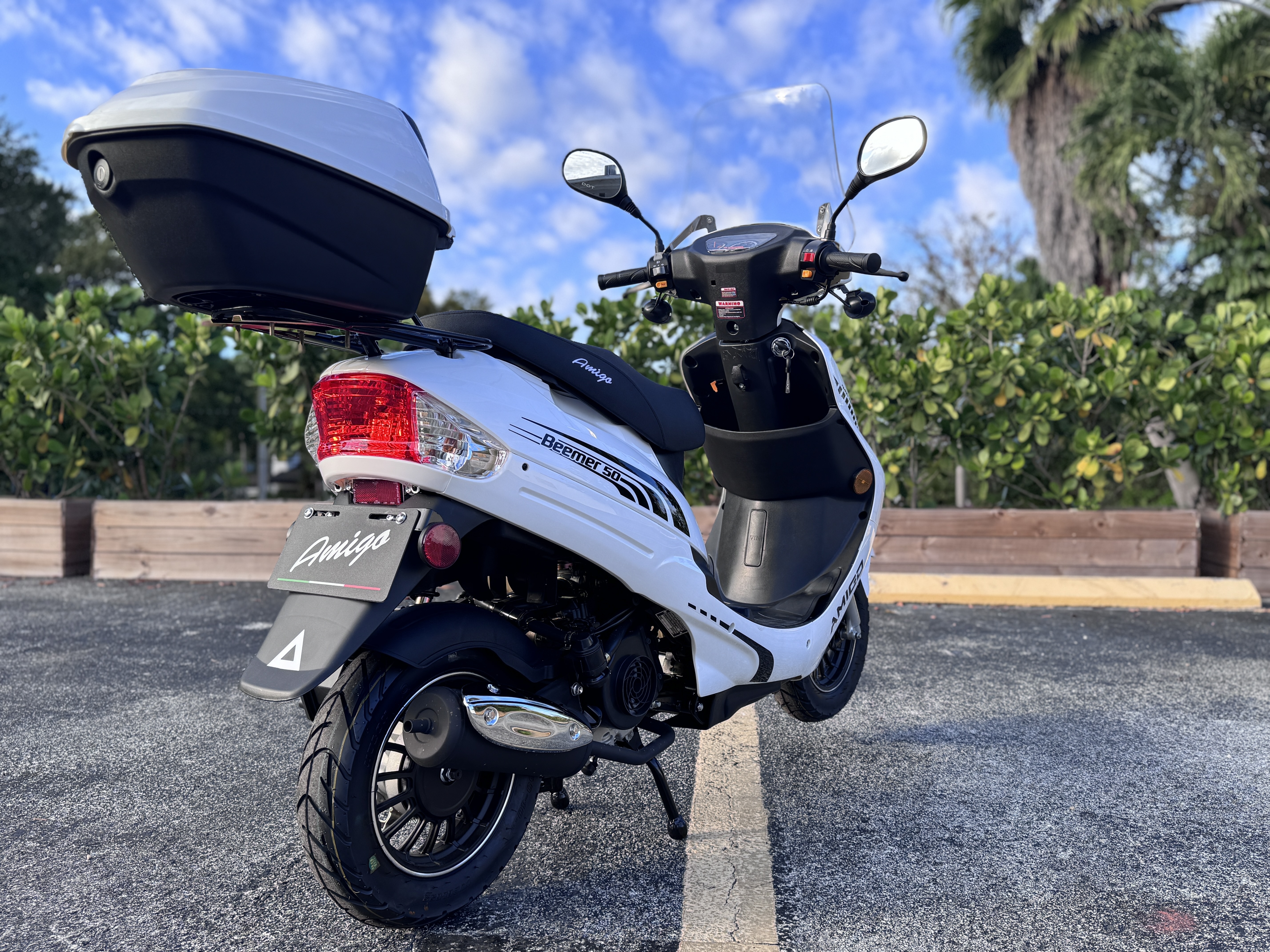 Featuring an automatic CVT transmission, the Beemer-50 offers true twist-and-go convenience, making it ideal for beginners and experienced riders alike. Practical upgrades such as a digital LCD display, adjustable windshield, lockable color-matched trunk, and USB charging port enhance everyday usability. Lightweight, economical, and fully EPA, DOT, and CARB compliant, the Amigo Beemer-50 is a smart and dependable choice for affordable transportation.