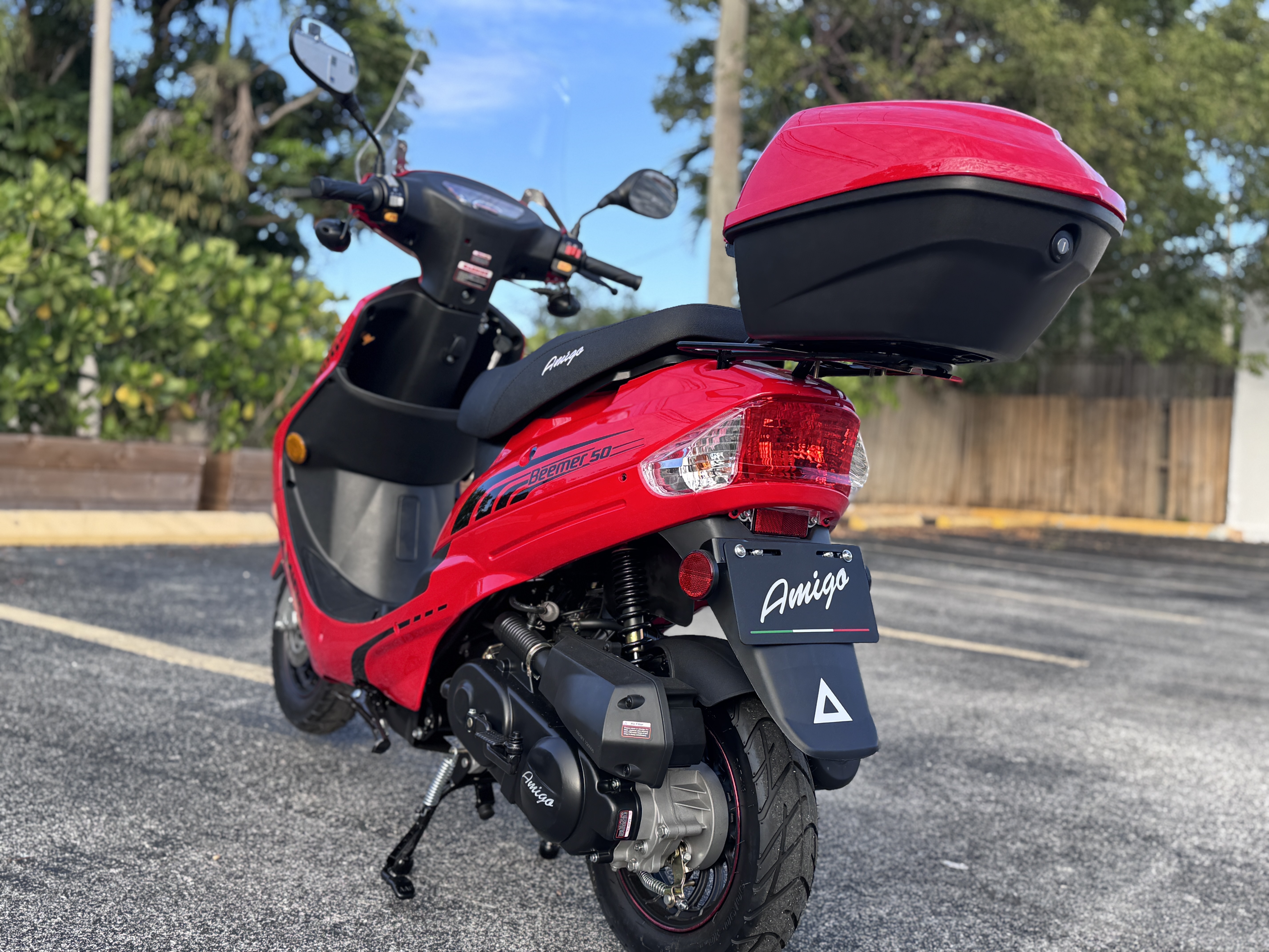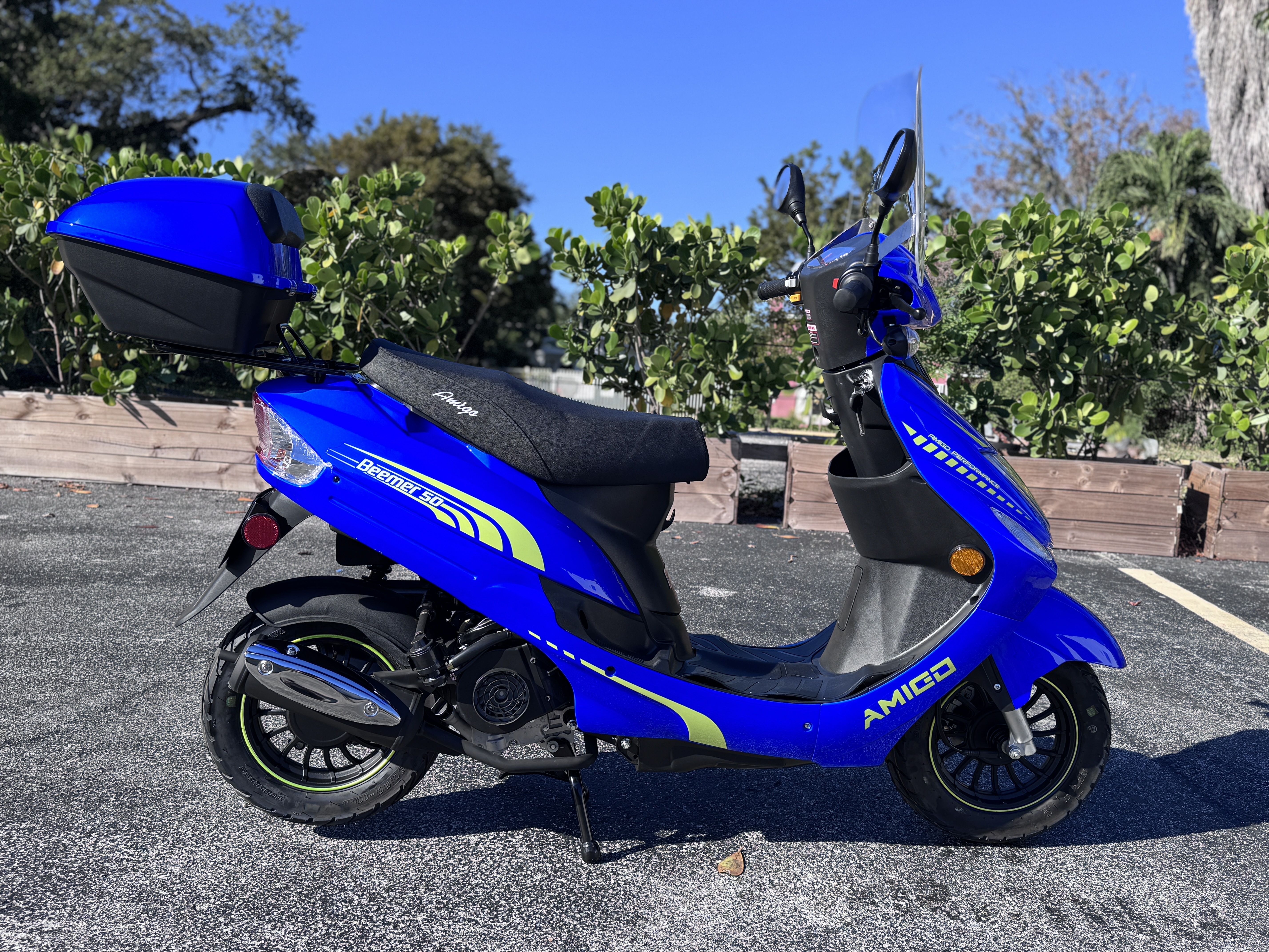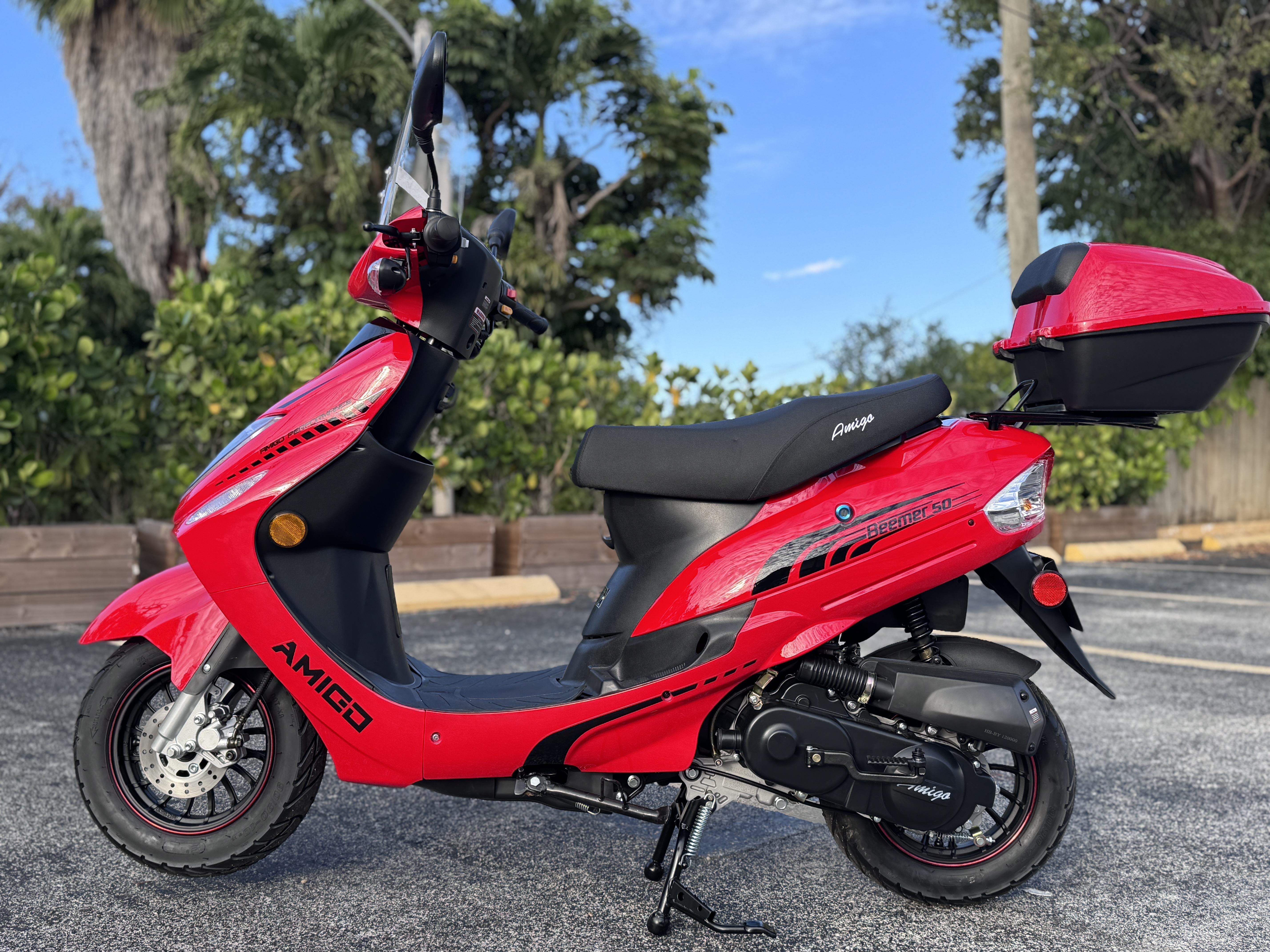 The Amigo Beemer-50 is a stylish and efficient 50-class street-legal scooter designed for daily commuting, campus riding, and neighborhood travel. Powered by a 49.6cc air-cooled 4-stroke engine, it delivers smooth and reliable performance with a top speed of up to 35–40 mph, while maintaining excellent fuel efficiency of up to 100 MPG.